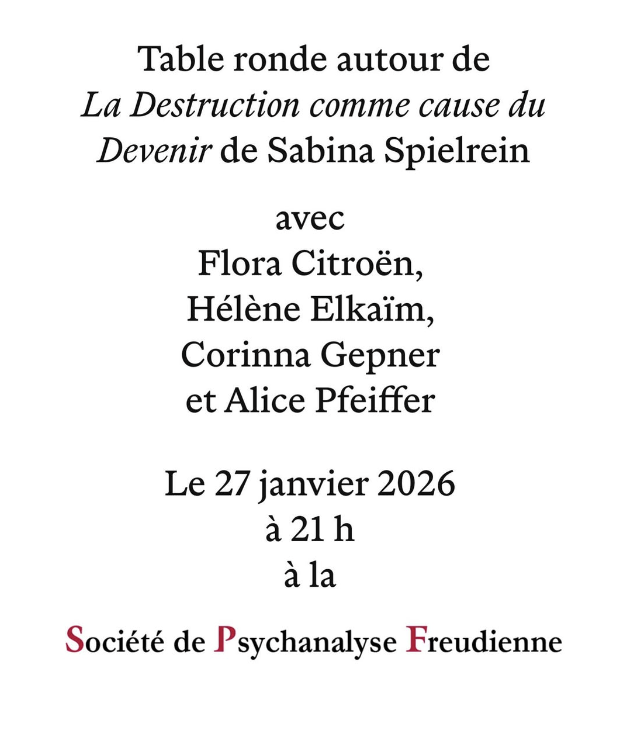 Dans le cadre du séminaire sur la pulsion de mort à la Société de Psychanalyse Freudienne, le 27 janvier 2026, Flora Citroën, Hélène Elkaïm, Corinna Gepner et Alice Pfeiffer ont présenté La Destruction comme Cause du Devenir de Sabina Spielrein, et plus largement le travail de cette psychanalyste oublié dans une triangulation entre Jung et Freud.