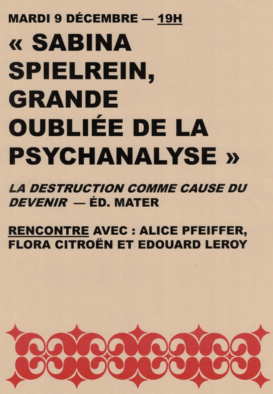 Mardi 25 novembre 2026, l’éditrice Flora Citroën et l’autrice et journaliste Alice Pfeiffer, qui signe la préface, ont présenté La Destruction comme cause du Devenir, texte pionnier sur la pulsion de mort de la psychanalyste Sabina Spielrein.