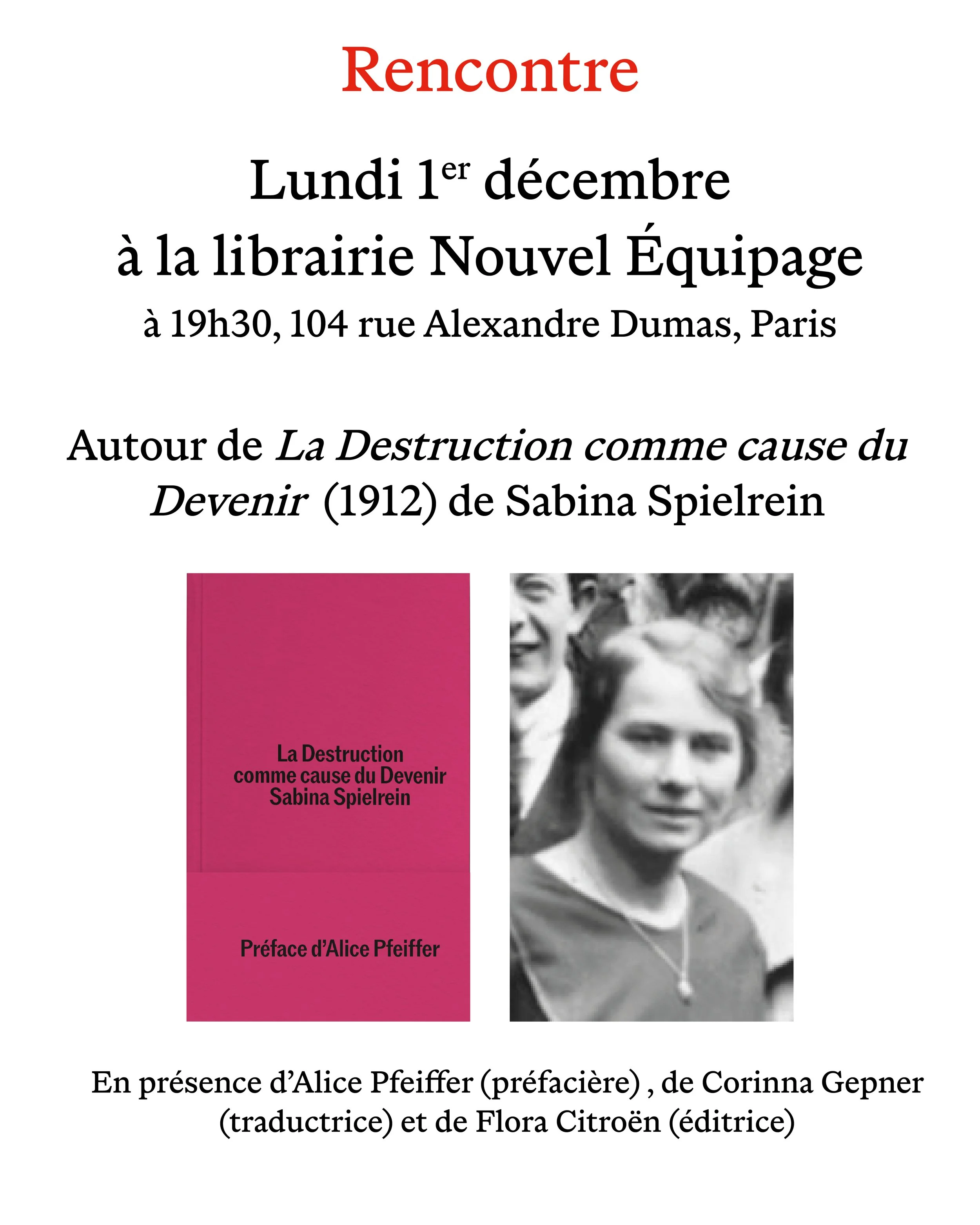 Lundi 1er décembre et mardi 9 décembre 2025 ont eu lieu deux rencontres, une au Nouvel Équipage avec l’éditrice Flora Citroën, la traductrice Corinna Gepner et l’autrice, journaliste et préfacière Alice Pfeiffer, et une autre à la librairie Centrale pour présenter La Destruction comme cause du Devenir de la psychanalyste Sabina Spielrein.